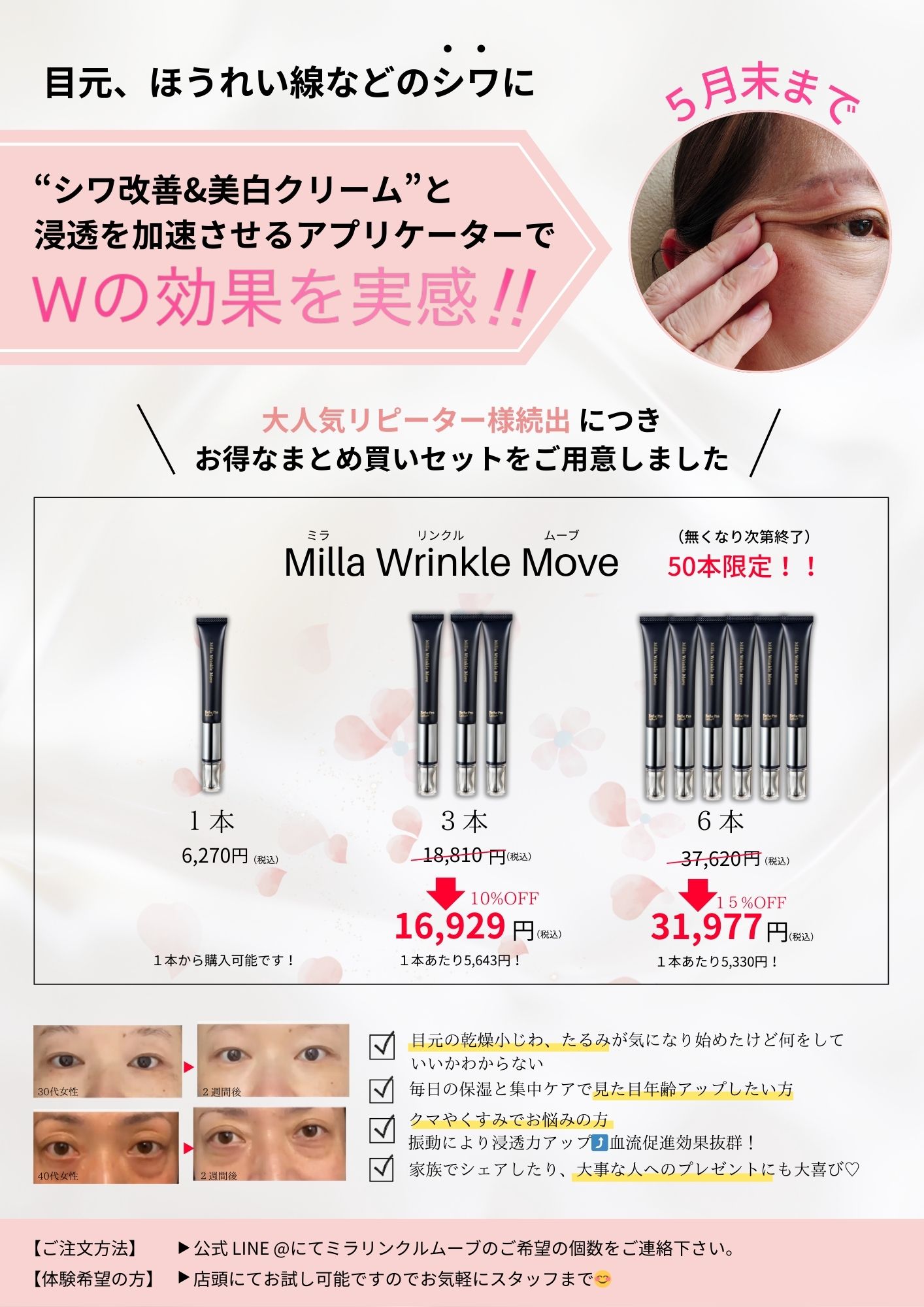 【ターゲット】20代後半〜40女性、【意識したポイント】目元のシワやほうれい線に悩みの方をターゲットにし、効果実感とお得感を伝わるように意識して作成しました。
